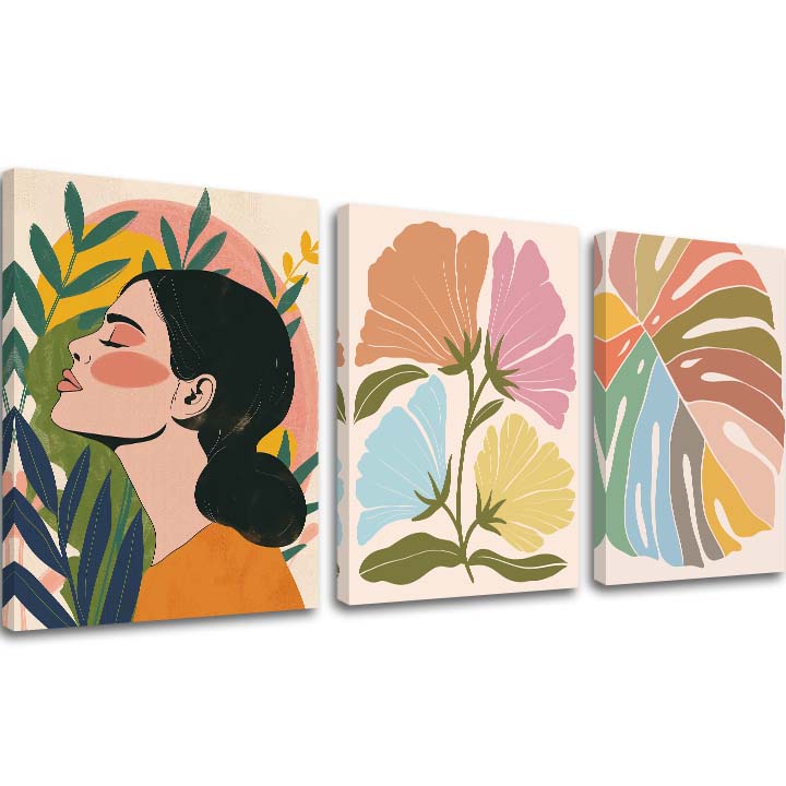 Zbirka Art in Simplicity vsebuje tridelne komplete slik z abstraktnim cvetjem, ženskimi silhuetami, organskimi linijami in nežno geometrijo. Kontrastne barve, čiste linije in poenostavljeni motivi bodo vašemu domu dodali svežino, igrivost in brezčasno eleganco.