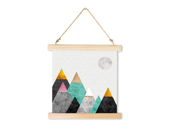 Viseče platno je na obeh straneh pritrjeno z lesenimi letvicami iz smrekovega lesa. Zahvaljujoč trpežni vrvici, ki je z ročaji pritrjena ob leseni okvir, lahko platno preprosto in elegantno obesite. Ponujamo vam različne barve obrob, ki jih lahko k platnu prilagodite po svojem okusu.
