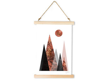 Viseče platno je na obeh straneh pritrjeno z lesenimi letvicami iz smrekovega lesa. Zahvaljujoč trpežni vrvici, ki je z ročaji pritrjena ob leseni okvir, lahko platno preprosto in elegantno obesite. Ponujamo vam različne barve obrob, ki jih lahko k platnu prilagodite po svojem okusu.